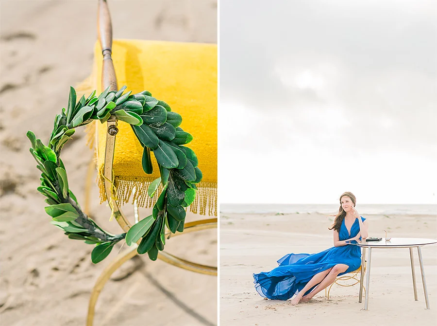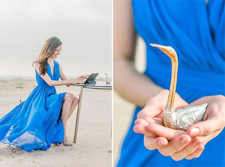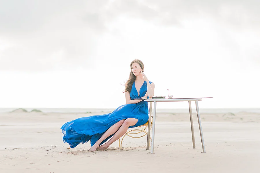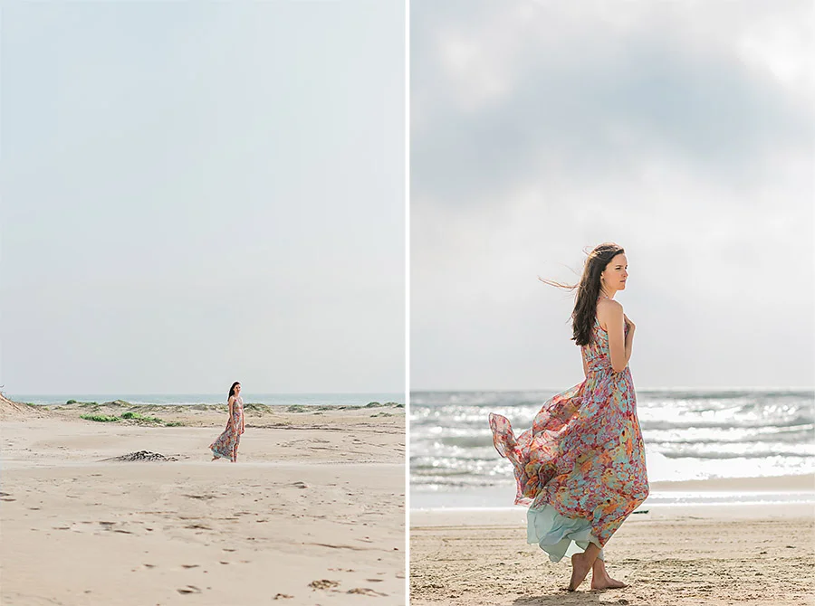 We scheduled and aimed for a sunrise session at one of the beaches of South Padre Island. While a delay in her schedule and dark clouds made the sunrise part of the session not possible, the outcome was just as beautiful as we had imagined. The vast open dunes of the beach created the perfect backdrop for Victoria to physically showcase what working with her as a creative designer entails for the client. More on this "vision to reality" journey in another blog post soon!